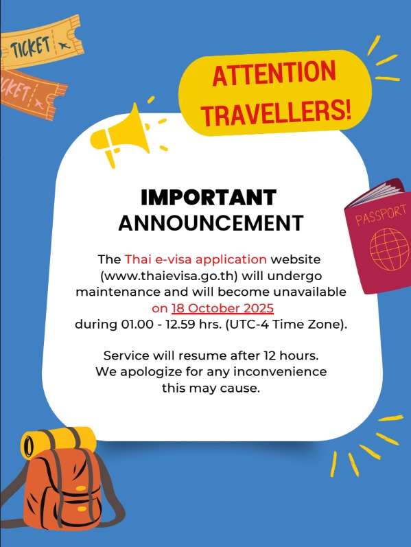 The Thai e-visa application website (www.Thaievisa.go.th) will undergo maintenance and will become unavailable on 18 October 2025 during 01.00 - 12.59 hrs. (UTC-4 Time Zone). Service will resume after 12 hours. We apologize for any inconvenience this may cause.